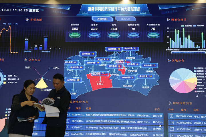 10月3日,正在河南省武陟县党建引领下层高效能管理核心,工做人员通过大数据管控平台,对日常排查发觉的矛盾胶葛、季候性严沉风险现患。(冯小敏 摄)!