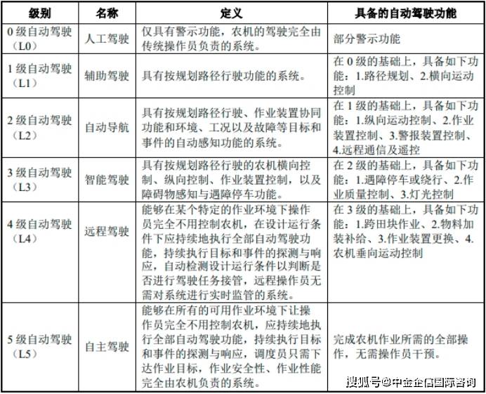 按照上述划分,国内实现规模化使用的农机从动驾驶系统次要为L1级(含部门L2级特定功能),即对应AF系列产物,而推出的农机无人驾驶系统对应L3级(含部门L4级特定功能),智能化程度更高,且是截至目前唯逐个家农机无人驾驶系统产物通过判定的企业。将来我国农机从动驾驶系统产物向功能集成化、少人化干涉的更高档级标的目的成长,目前我国的农机从动驾驶行业大规模使用的产档次于L1级(辅帮驾驶),仅等少数企业实现L2-L3级产物投入市场,已有手艺堆集和产物使用的企业无望正在农机进一步智能化市场中占领先发劣势。②农机配备智能化产物加快向多区域渗入,增量市场空间庞大:农田集约化和尺度化扶植、农业机械化程度是农机配备智能化产物的成长根本,而产物降本增效的结果和售价是农机配备智能化产物的成长动力,市场已逐步从新疆、等保守大规模农田集中区域,向、甘肃、、江苏、陕西、山东、湖北、湖南、广西等区域渗入,逐步从中大型农机向小型农机渗入。我国小麦、玉米、棉花产区多位于以平原地形为从的东北、西北等区域,大型农机合用性较强,且高尺度农田扶植较早,农场从及农户利用农业机械的动力强,而复杂地形区域种植做类多样,人均亩数较低,目前以小型农机居多,全体农业机械化率仍有较大提拔空间。农业农村部印发《“十四五”全国农业机械化成长规划》明白提出,全国农做物耕种收分析机械化率要从2020年的71%提高到2025年的75%,此中丘陵山区县(市、区)农做物耕种收分析机械化率要从49%提高到跨越55%。此外,复杂地形区域农户对产物性价比和利用结果更为,跟着财产链成长完美和上逛成本下降以及头部企业规模提高、自动提拔成本节制能力,农机配备智能化产物售价持续下降,且头部企业针对复杂地形适配性做了大量储蓄和优化,鞭策农机配备智能化产物加快向复杂地形区域和小型农机渗入。小型农机差同性较大且分布更为分离,但保有量远远跨越中大型农机,为农机配备智能化产物奠基广漠的增量市场空间。以拖沓机为例,按照数据虽然中大型拖沓机保有量占比有提高趋向,但截至2021岁暮全国小型拖沓机保有量达到1,674。99万台,是中大型拖沓机保有量的3。36倍。③农机从动驾驶系统市场空间广漠:近年来国内农机从动驾驶系统快速成长,但全体渗入率仍相对较低,取国外发财农业国度的差距较着。按照演讲,美国农机从动驾驶系统使用正在近20年内敏捷普及,以使用农机从动驾驶系统的种植面积占比看,2019年美国玉米、棉花、水稻、高粱、大豆和冬小麦的渗入率均跨越50%,此中棉花种植和高粱种植使用渗入率别离达到64。5%和72。9%,欧洲地形并不适宜中大型拖沓机耕种,但2016年仿照照旧达到8%的渗入率,当前已超40%,打算2025年实现50%。按照演讲,正在农业机械化率和农机从动驾驶系统渗入率不竭提高,农机从动驾驶系统单价下降但无效带动产物普及使用的布景下,国内农机从动驾驶系统的新增(新安拆农机从动驾驶系统)市场规模无望于2030年达到75亿元,2024-2030年新增市场规模合计312亿元。进一步考虑到农机从动驾驶系统的一般利用周期为5年,农机从动驾驶系统存量更新的需求也正在逐渐添加,按照目前农机从动驾驶系统市场存量数据,按照5年更新周期进行存量市场更新需求测算,认为2024-2030年存量更新市场规模合计53亿元。综上,国内2024-2030年农机从动驾驶系统市场规模无望达到365亿元。④聪慧农场是将来农业新图景,无人农场落地项目会逐年添加,市场空间大:跟着现代消息手艺和智能配备等取农业深度跨界融合,将来将实现农业出产全过程的消息、定量决策、智能节制、精准投入、个性化办事,成长为聪慧农业。除农机智能化不竭提高以外,聪慧农业的成长趋向还包罗无人化敏捷成长以及对农业数据的操纵程度不竭提高。A、无人化农场成为将来农业新图景:聪慧农场亦称无人化农场,其素质是实现机械换人。中国工程院院士罗锡文用了高度归纳综合的五句话来描写无人化农场:“耕做管收出产环节全笼盖;机库田间转移功课全从动;从动避障异况泊车保安然;做物出产历程实施全;智能决策精准功课全无人。”无人化农场是劳动力正在不进入农场的环境下,采用物联网、大数据、人工智能、5G、机械人等新一代消息手艺,通过近程节制、全程从动节制或机械人自从节制,完成所有农场出产功课的出产模式,是保守农场颠末机械化、从动化两个成长阶段后的最终形态。其成长方针是机械人逐渐替代人力,深度参取农业出产的全过程。按照参取深度的分歧可将无人化农场划分为三个进阶形态:近程节制无人化农场、无人值守无人化农场和自从功课无人化农场。